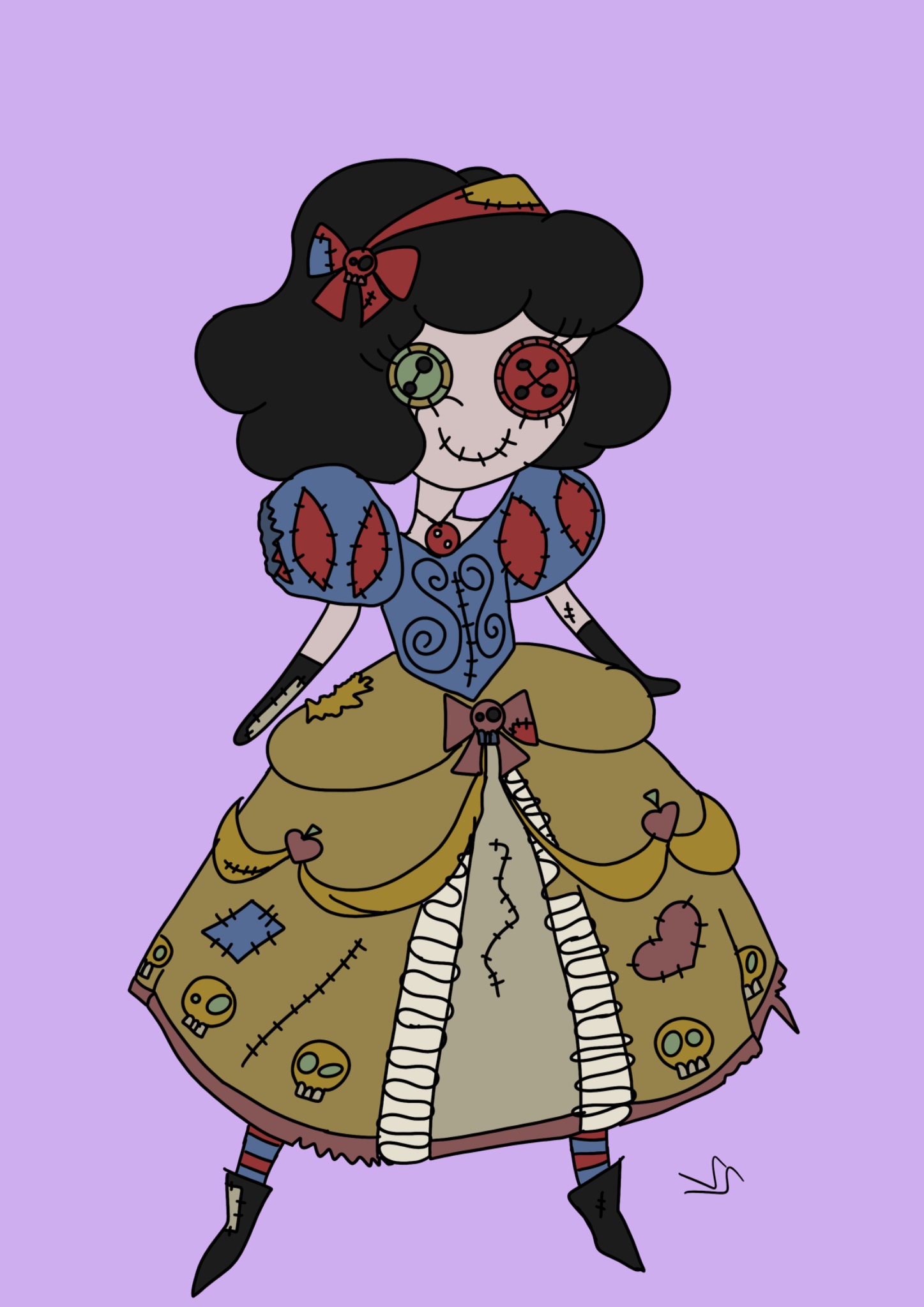 Dieses Doodle zeigt eine faszinierende Darstellung von Schneewittchen, jedoch in einer unkonventionellen und leicht gruseligen Interpretation. Die Figur erscheint wie eine Puppe mit grossen, runden Knopfaugen und zahlreichen Nähten, die überall auf ihrem Körper zu sehen sind.