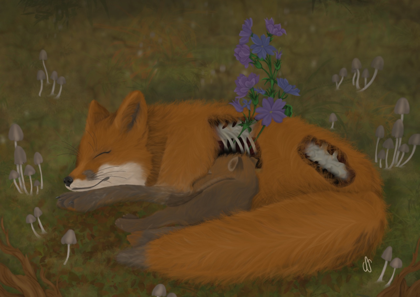 Die Mutterfuchs-Figur erscheint als würde sie friedlich schlafen, obwohl ihr Körper bereits verwehst und Blumen aus ihr wachsen. Ihre Knochen sind sichtbar, was dem Bild eine ungewöhnliche und tiefgründige Dimension verleiht. Trotz dieser Verwandlung strahlt Mama Fuchs Ruhe und Geborgenheit aus, während sie ihr Baby beschützt.