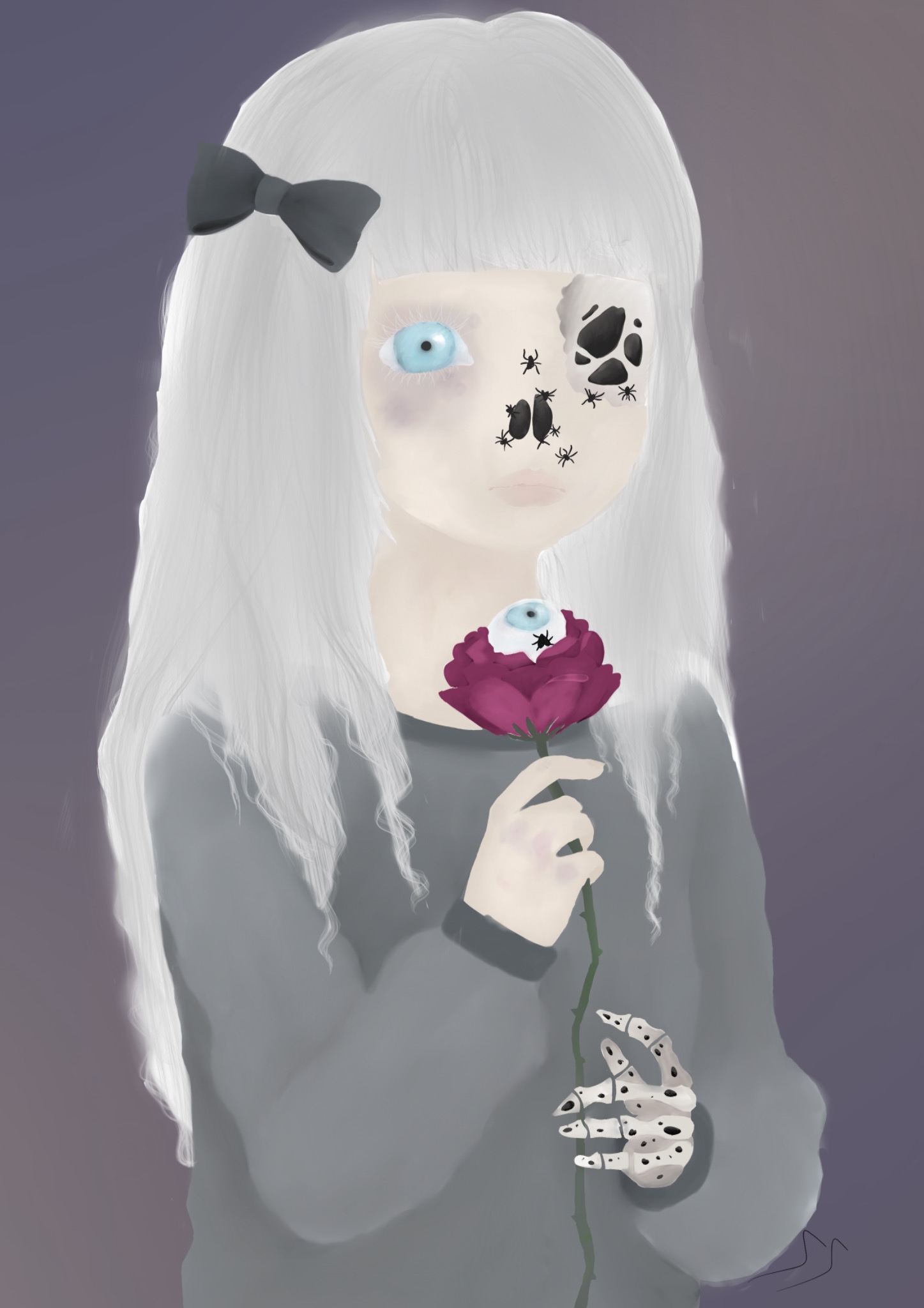 Ihre eine Gesichtshälfte ist bereits verweht, und anstelle eines Auges krabbeln Spinnen aus der leeren Augenhöhle. Dieses beunruhigende Detail verleiht dem Mädchen eine unheimliche Aura. In ihrer Hand hält sie eine Rose, auf der sich ihr zweites Auge befindet, das in gleicher Weise von blauen Flecken gezeichnet ist. Dieser Kontrast zwischen zarter Schönheit und morbider Darstellung macht das Bild faszinierend und verstörend zugleich.