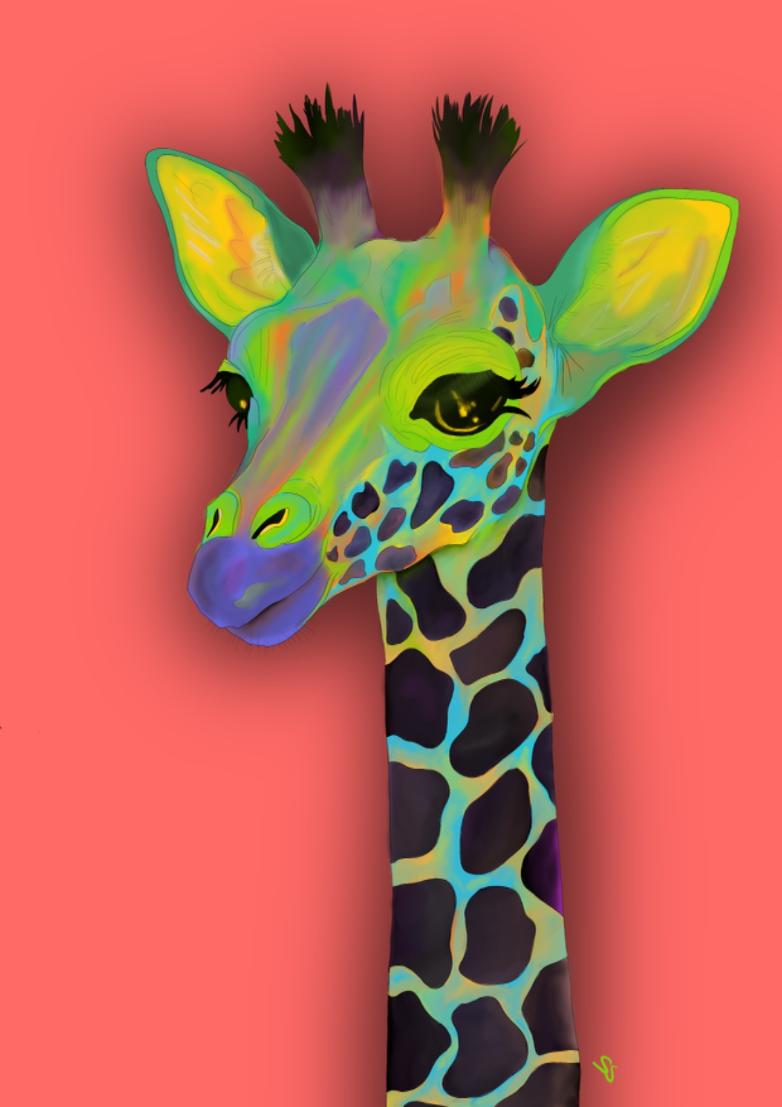 Die Giraffe ist in einem farbenfrohen Mosaik aus Grüntönen, Gelbtönen, Blautönen, Violett und Orange dargestellt. Diese Vielfalt an Farben verleiht der Giraffe eine lebendige und dynamische Erscheinung und erzeugt einen visuellen Wirbelwind aus Farbenergie.
