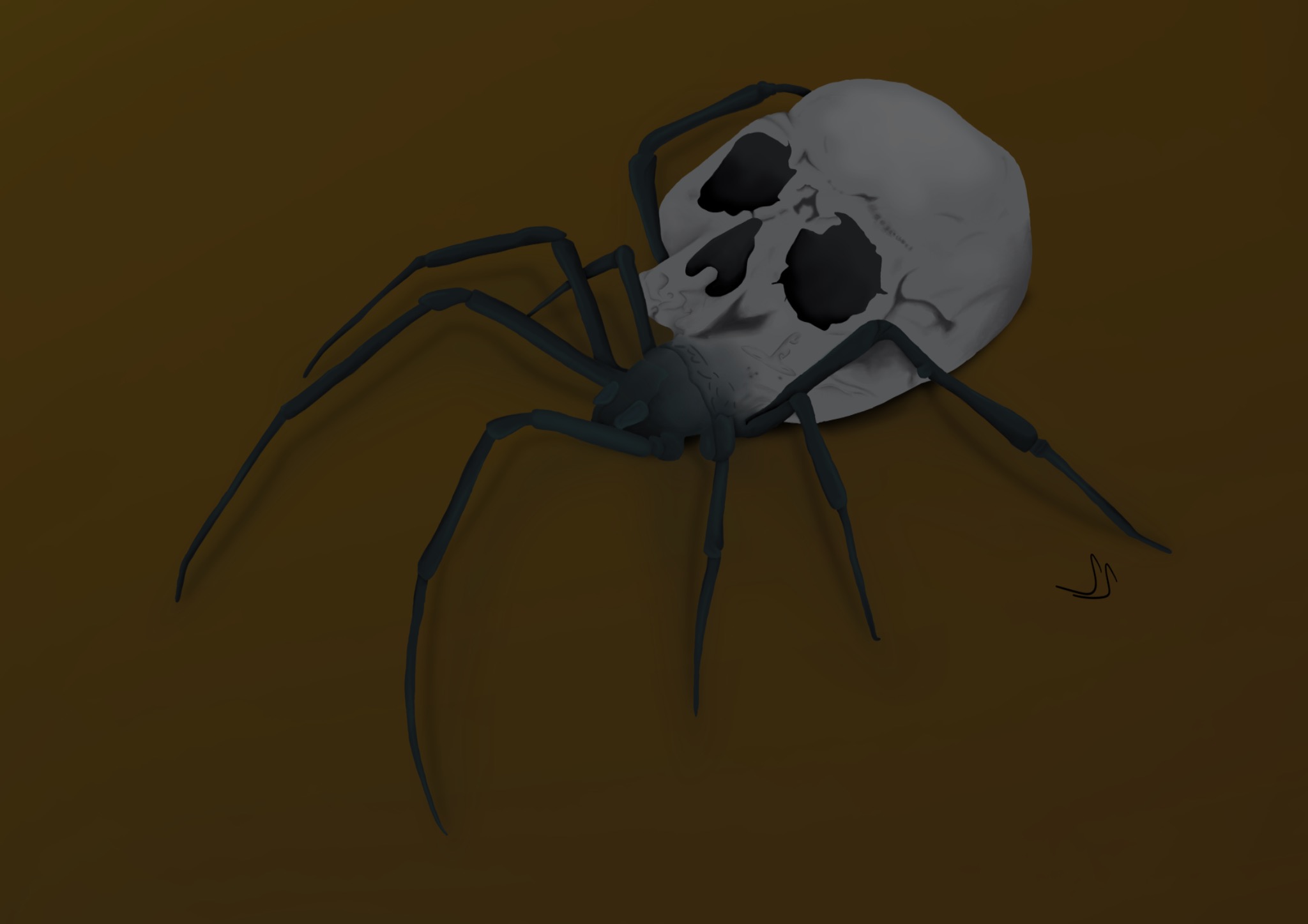 Die Spinne bewegt sich auf einem ebenso düsteren Hintergrund, der in Brauntönen gehalten ist und von geheimnisvollen Schatten durchzogen wird. Die düstere Atmosphäre verstärkt den Eindruck von Unheimlichkeit und Mysterium, der von der ungewöhnlichen Kreatur ausgeht.
