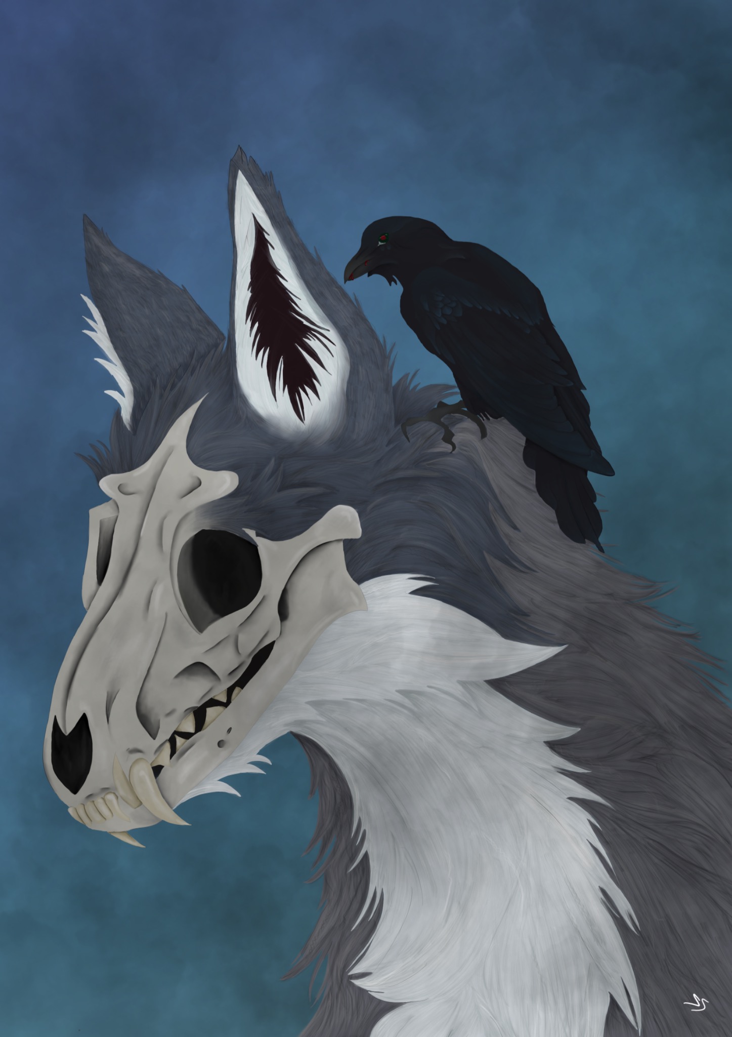 Im Mittelpunkt des Bildes steht ein eindrucksvoller skelettierter Wolf mit leerem Blick und markanten Knochen, die sein Gesicht bilden. Seine Augenhöhlen wirken düster und geheimnisvoll, während der Rest seines Körpers noch immer von seinem pelzigen Mantel bedeckt ist. Auf seiner Schulter sitzt ein Rabenvogel. Bei genauerem Hinsehen entdeckt man, dass der Rabe blutige Überreste des Wolfes in seinem Schnabel trägt.